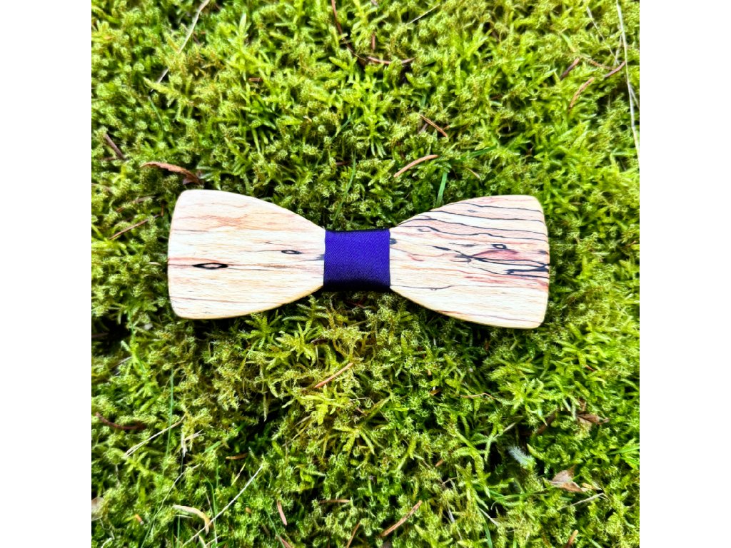 Dřevěný motýlek z bukového dřeva s elegantní stuhou laděnou do námořně modré barvy.
